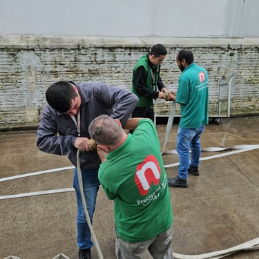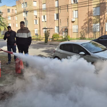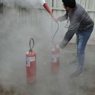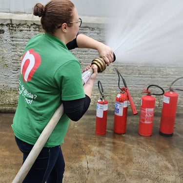 Exercícios de combate a incêndios com extintores e hidrantes.